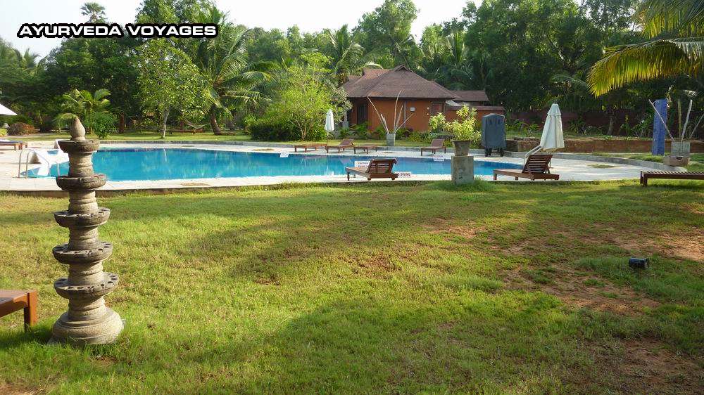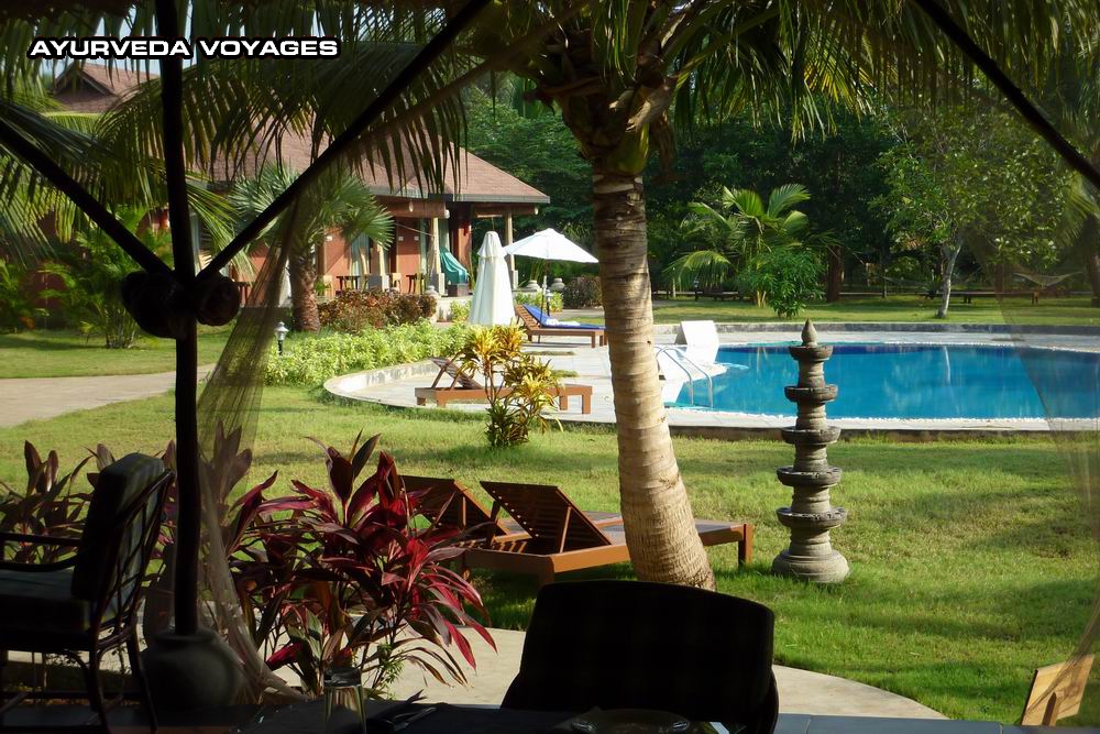 Le restaurant réservé aux curistes ayurvédiques au bord de la piscine privée est charmant, les repas sont établis sur prescriptions des vaidyas.