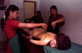 des huiles soit des poudres, avec les mains ou avec les pieds, des médicaments régénérateurs en pillules et aussi des bains de vapeur saturés d'huiles macérées appropriées. Les bains d'herbes (hules macérées) sont aussi utilisés. |